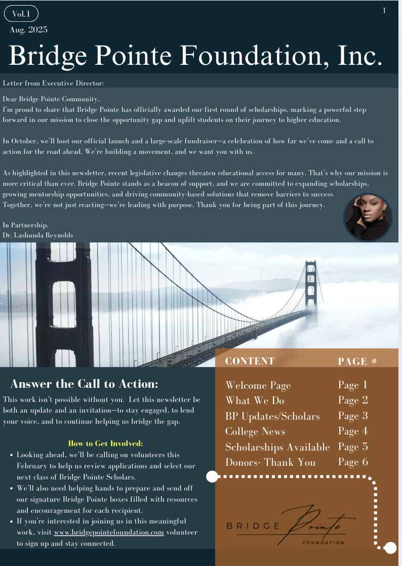 Bridge Pointe Foundation founded in May 2025, empowers under‑resourced students to achieve their post‑secondary dreams by providing equitable access to high‑quality educational resources, personalized mentorship, and community partnerships. We deliver test‑prep workshops, college‑readiness seminars, and financial assistance while connecting students with mentors—educators, professionals, and alumni—to foster leadership, critical‑thinking, and self‑advocacy skills. Through partnerships we bridge resource gaps—securing scholarships and enrichment opportunities. We believe closing the opportunity gap is not just about access—but about nurturing the whole student, advocating for change, and celebrating each milestone toward becoming tomorrow’s leaders and change‑makers.
